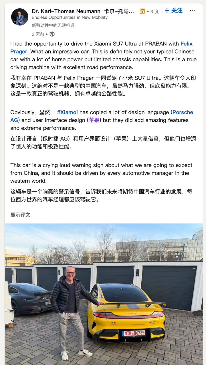 日前,大众中国区前 CEO Dr.Karl-Thomas Neumann 在领英发文,其近期体验试驾了小米 SU7 Ultra,并且表示对该车型「印象深刻」。