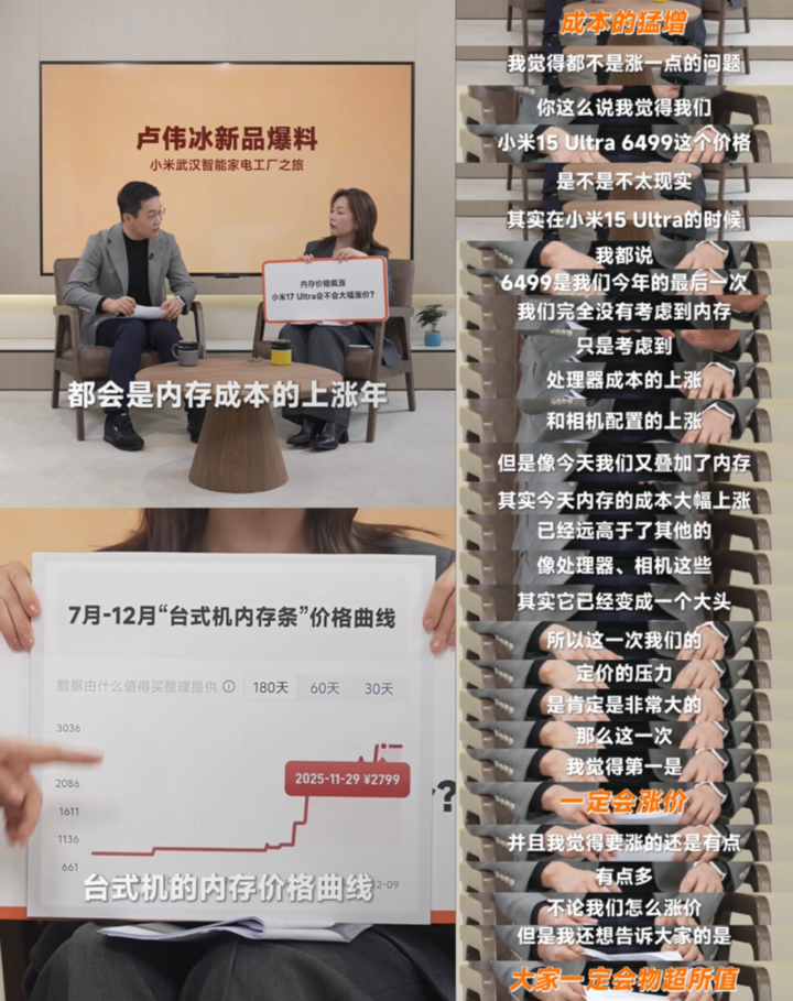 针对小米 15 Ultra「最后一次 6499 元」,卢伟冰直言,当时并没有完全考虑到内存,仅仅是基于处理器成本、相机配置上涨而作出的判断。