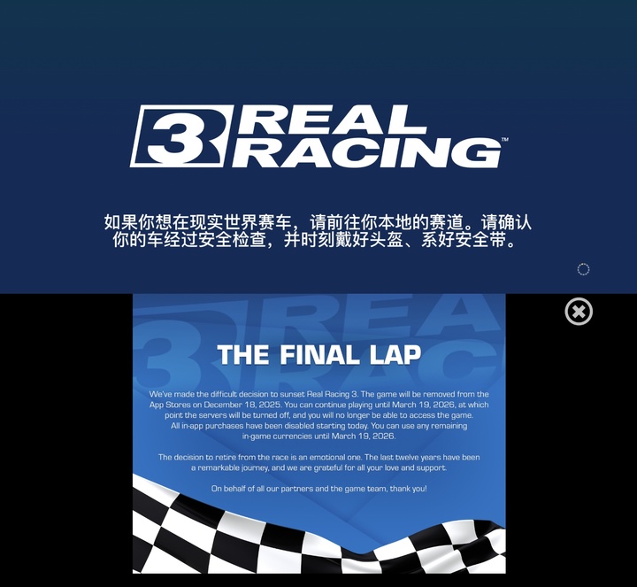 日前,EA 旗下移动平台赛车类游戏《真实赛车 3》(REAL RACING 3)宣布,已在近日(12 月 18 日)正式从 App Store、Google Play 下架游戏,并且关闭游戏内购。