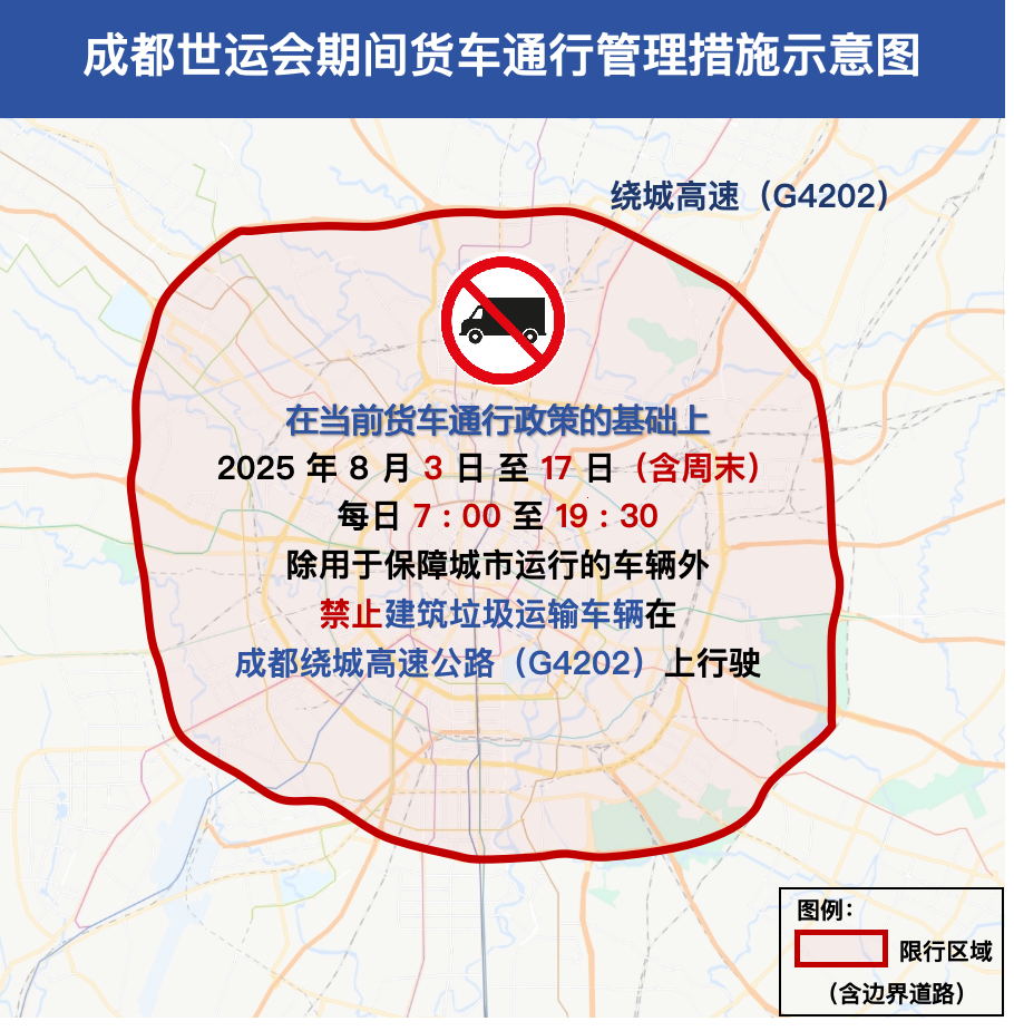 为保障成都绕城高速公路的城市主干线通行效率,2025年8月3日至17日,每日7:00至22:00,建筑垃圾运输车辆将被限制在成都绕城高速公路(G4202)通行,保障城市运行的货运车辆不受影响。